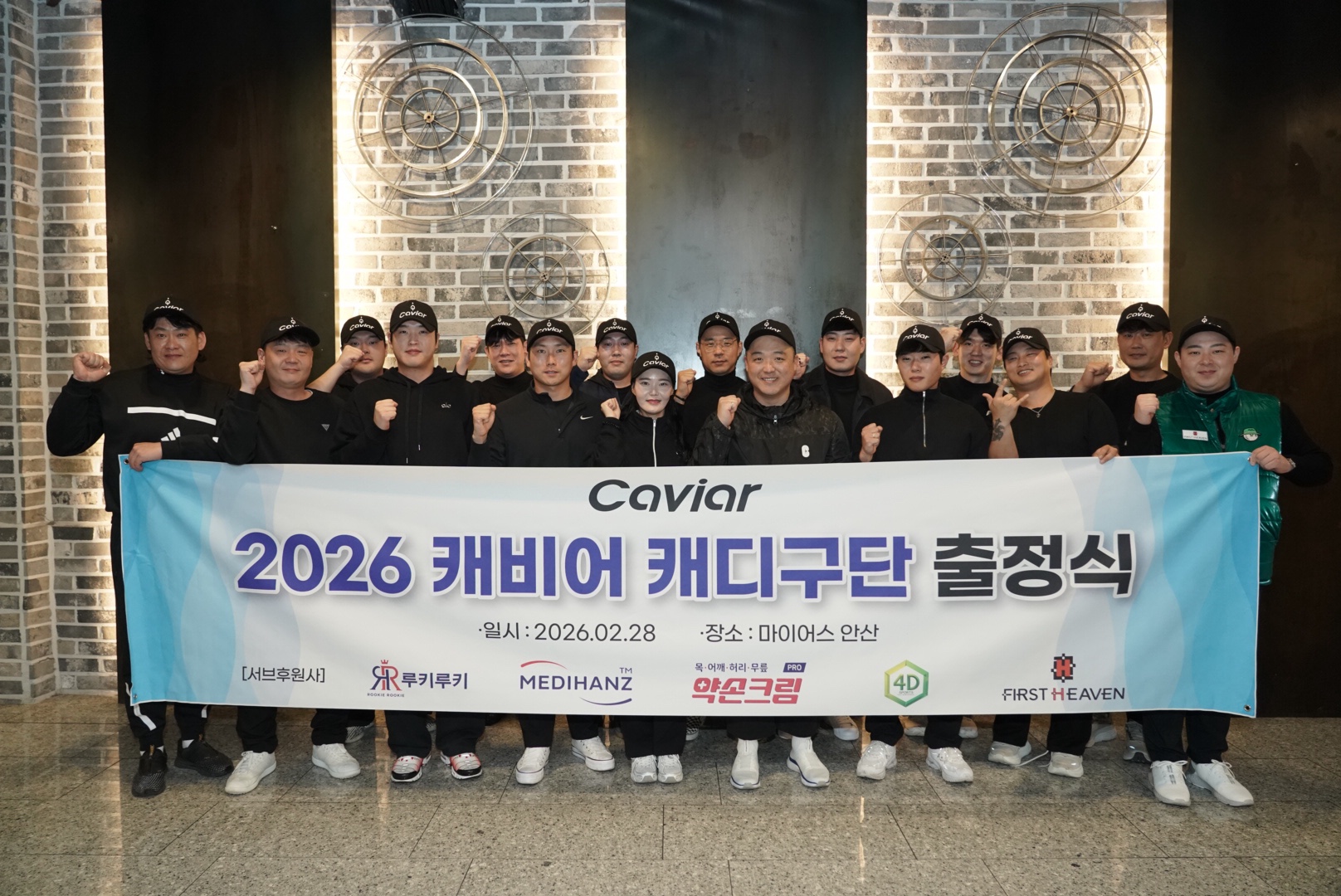 포디스포츠는 28일 경기도 안산에 위치한 마이어스 안산에서 김혜수 단장을 비롯한 소속 캐디 20인과 캐비어 아이앤씨테크(김찬석 대표), 퍼스트헤븐(신동호 대표), 루키루키(김동하 대표), 메디핸즈(박정민 대표)가 함께 하는 가운데 '2026 캐비어 투어 캐디구단 출정식'을 가졌다.